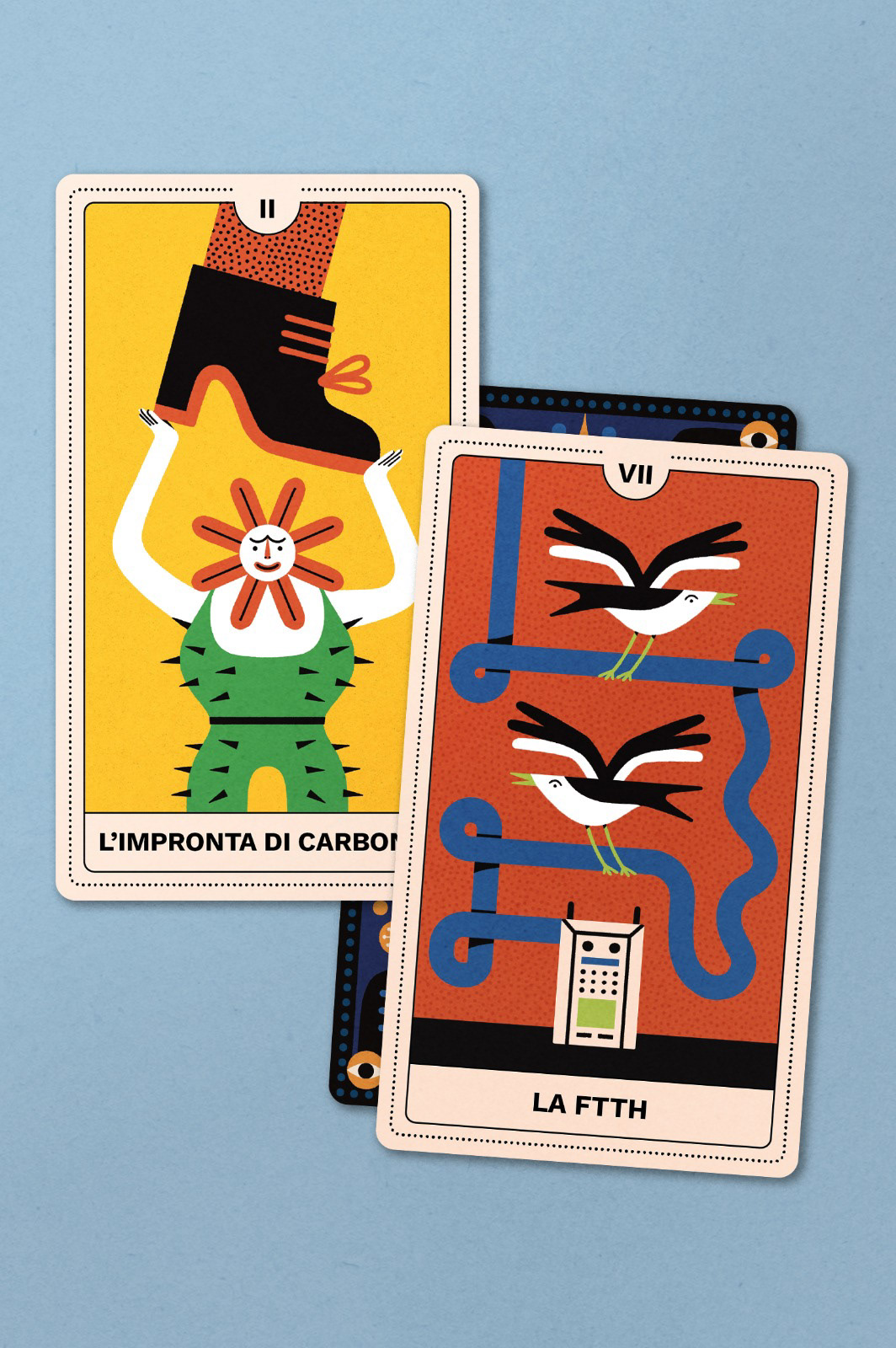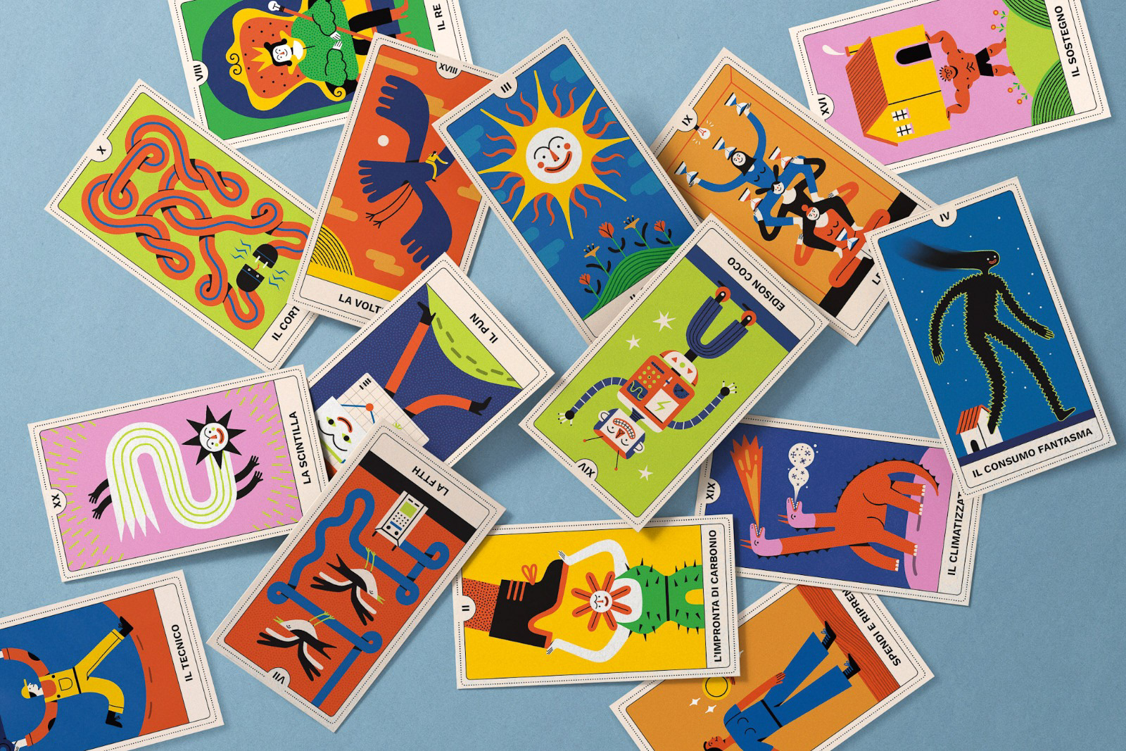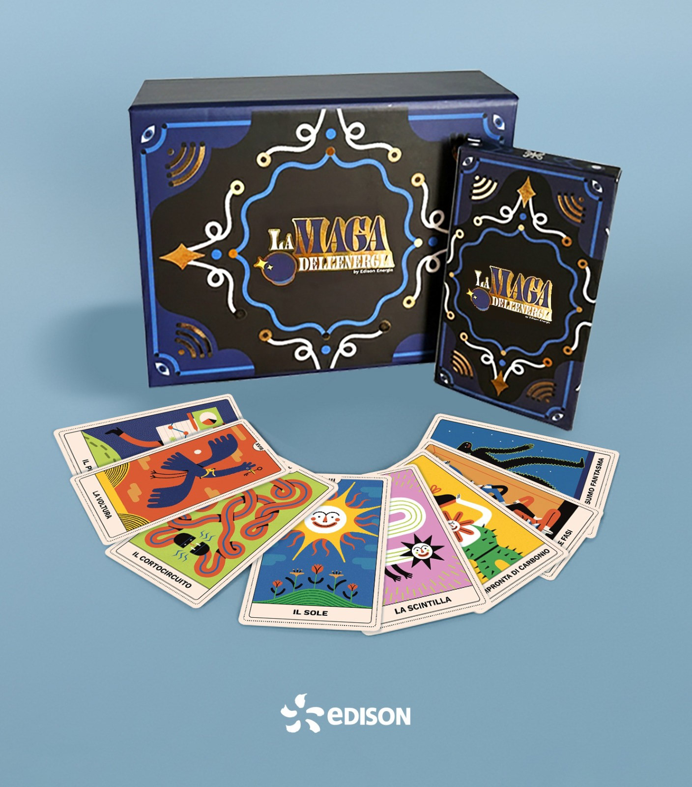 Si tratta di un mazzo di 22 tarocchi e box illustrati ispirato al mondo dell’Energia, utilizzato per una campagna social con protagonista Cloris Brosca, la famosa cartomante degli anni ‘90.